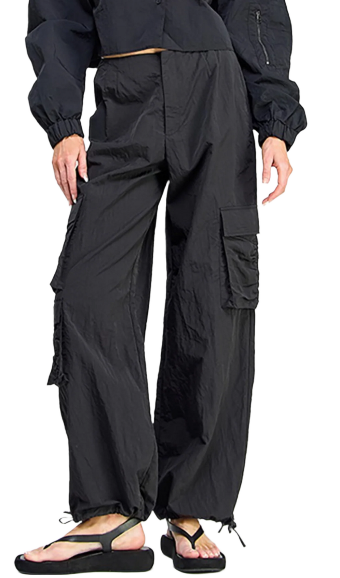 A nylon pants with pockets on the sides by the knees and adjustable straps at...