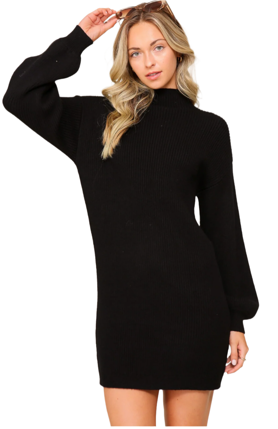 THIS WOMEN'S SWEATER DRESS FEATURES LONG SLEEVES, ACHIC MOCK NECK, AND A FLATTERING SHORT LENGTH,...