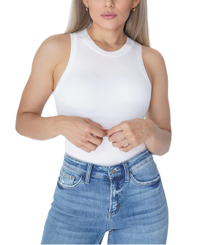 A round neck sleeveless bodysuit is a form-fitting top designed to be tucked into pants...