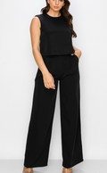 This set features a beige square-neck top with structured shoulder pads paired with elegant wide-leg pants, creating a chic and confident look.