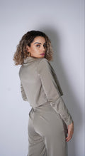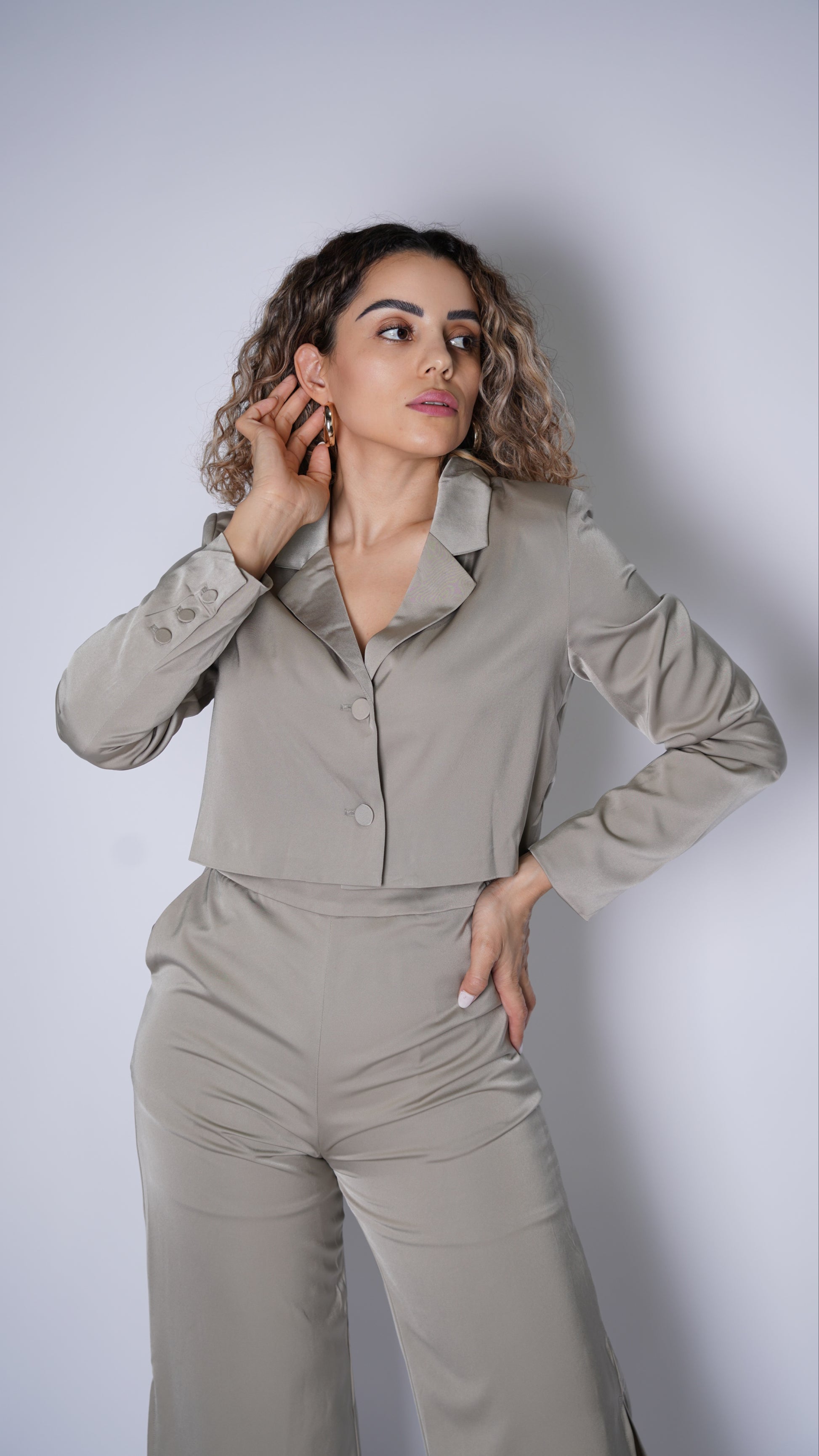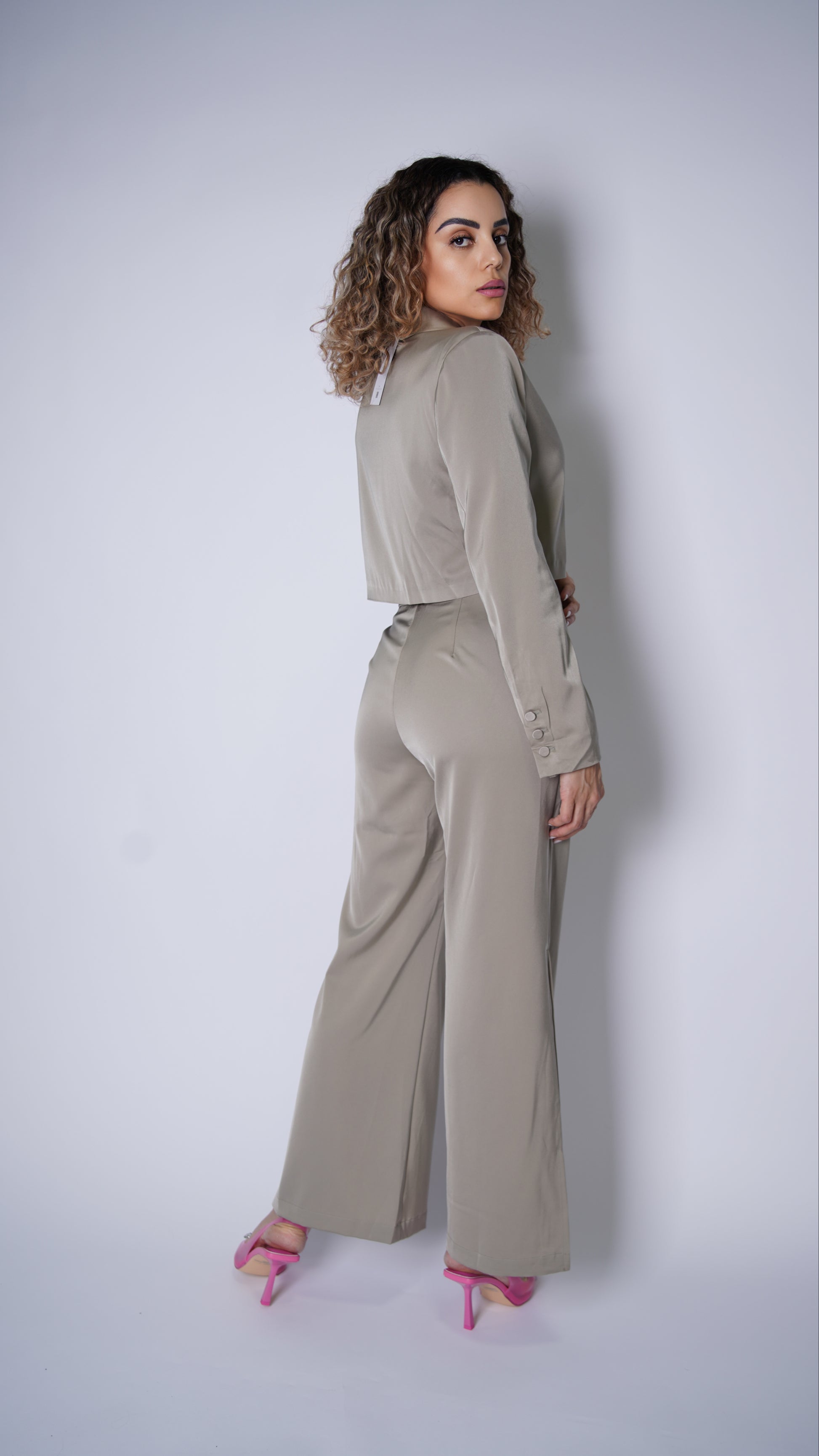 Elevate your style with The Catalina Set, featuring a stunning sage satin cropped blazer and matching pants. Crafted from 100% polyester, this set offers a silky smooth texture and a subtle sheen that catches the light beautifully. The cropped blazer is designed to highlight your waist, creating a chic and modern silhouette, while the tailored pants provide a comfortable yet polished fit. Perfect for making a confident statement at work or special events, this set combines elegance with versatility. Modeled by a 5'7" individual wearing Medium, The Catalina Set is your go-to choice for effortless sophistication.