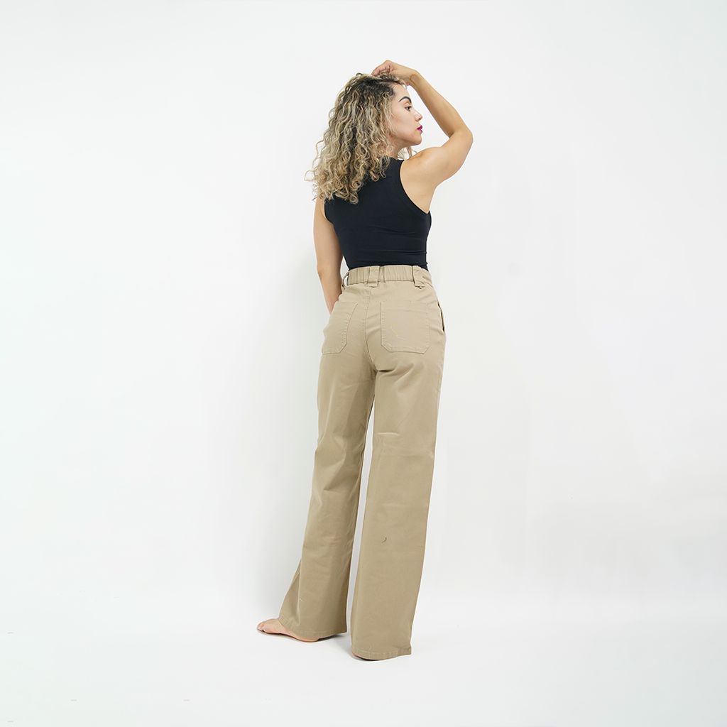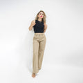 Woman wearing a black top and beige pants on a white background