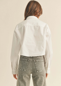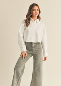 A white cropped button-down shirt is a fashionable and contemporary essential. It has a shorter length, ending above the waist or at the midriff, and includes a classic collar, front buttons, and long sleeves. The crisp white hue adds a clean and adaptable element, allowing for effortless pairing with different bottoms to create a stylish and cohesive outfit.