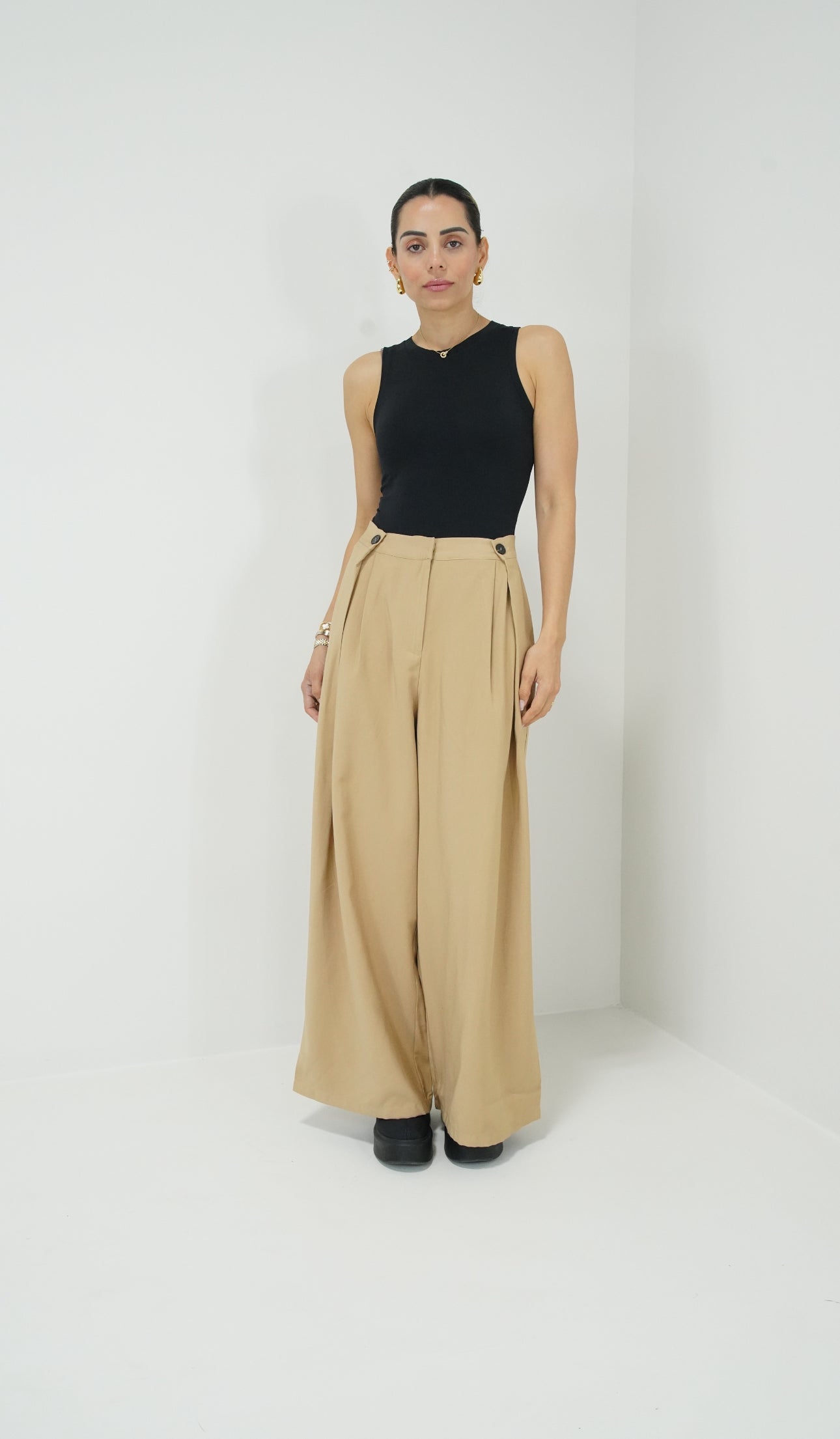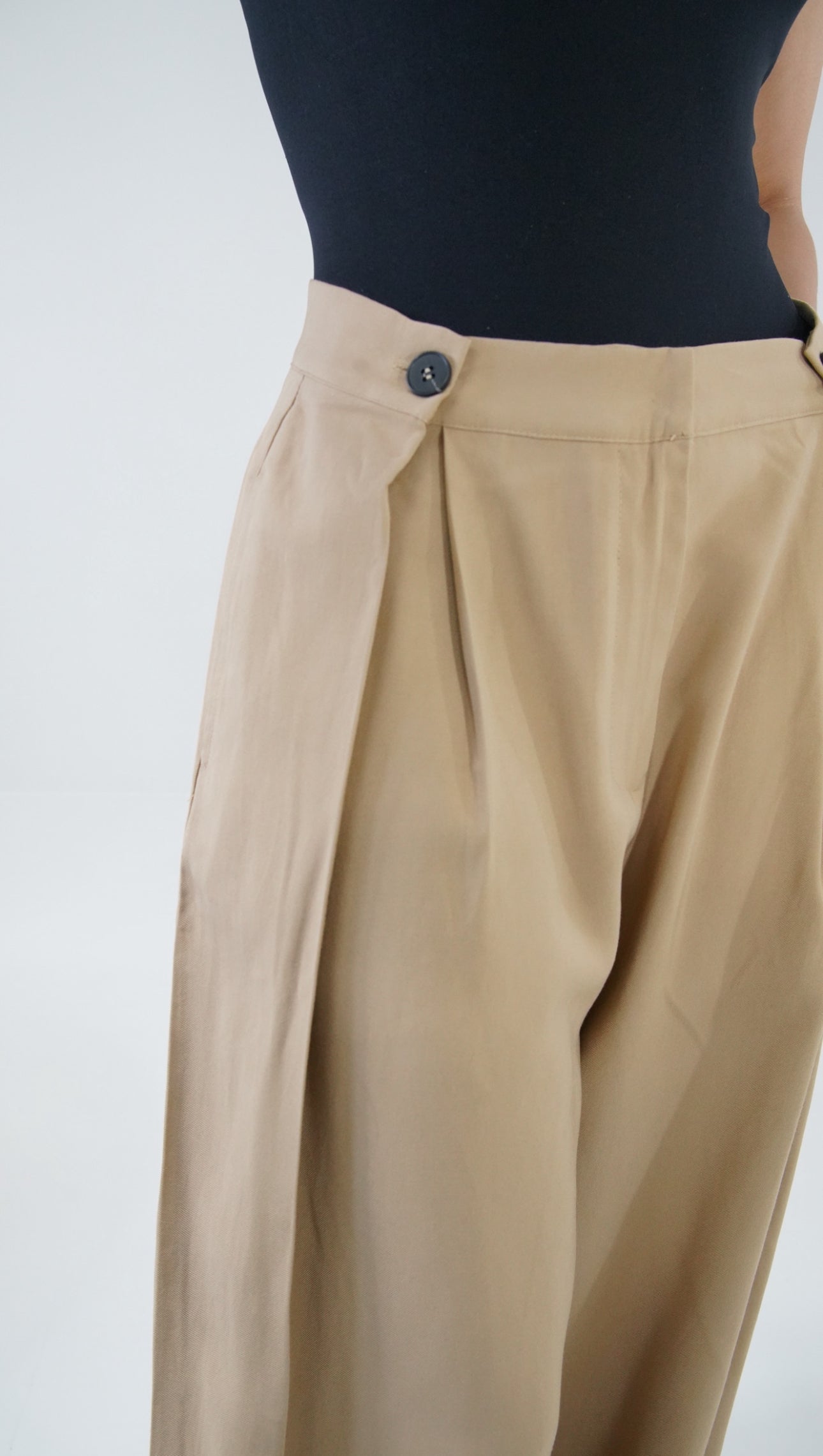 Two-tucked wide pants are a style of trousers that feature two pleats or folds at the waistline, creating a more voluminous and relaxed fit. These pants are known for their comfortable and roomy silhouette, making them a popular choice for a casual yet stylish look.