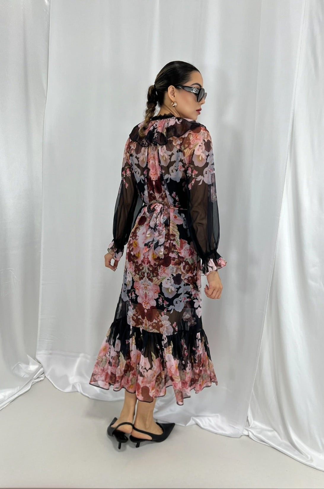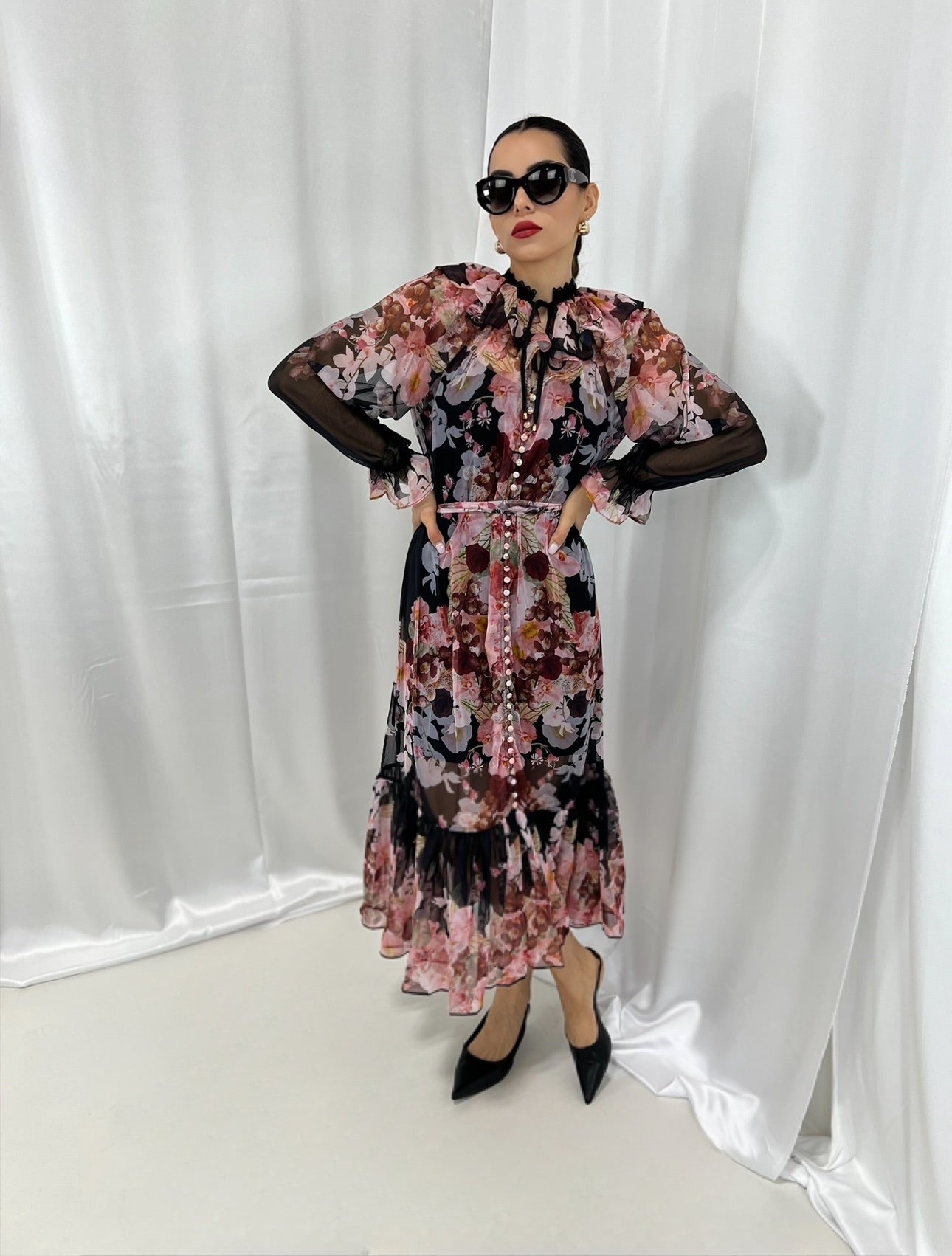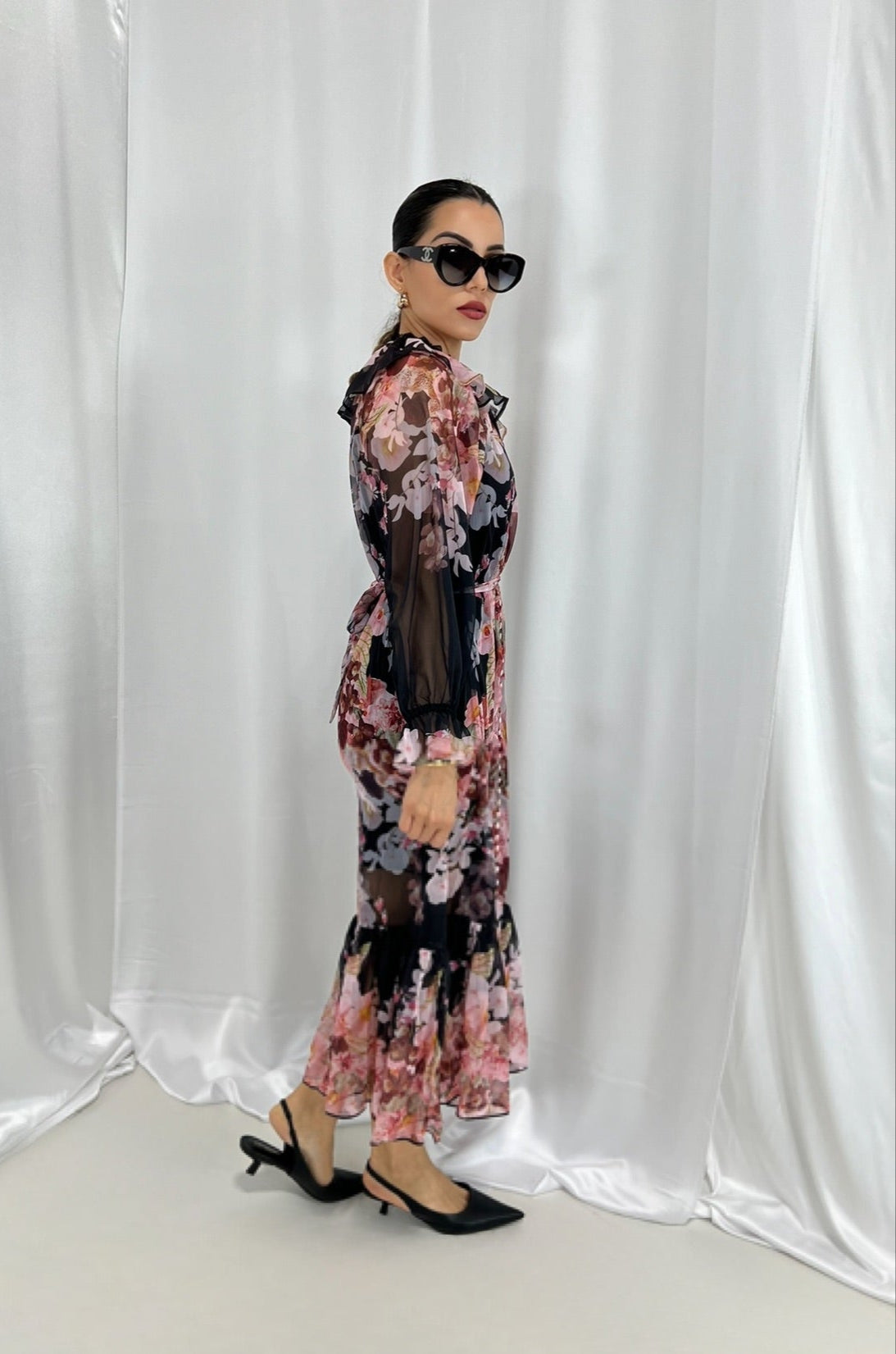The Goddess Floral Dress is a stunning blend of elegance and femininity, featuring a beautiful black and pink floral pattern. Its belted waist enhances your figure, creating a flattering silhouette that exudes confidence and grace. Perfect for special occasions or stylish everyday wear, this dress offers both comfort and sophistication to elevate your wardrobe effortlessly.