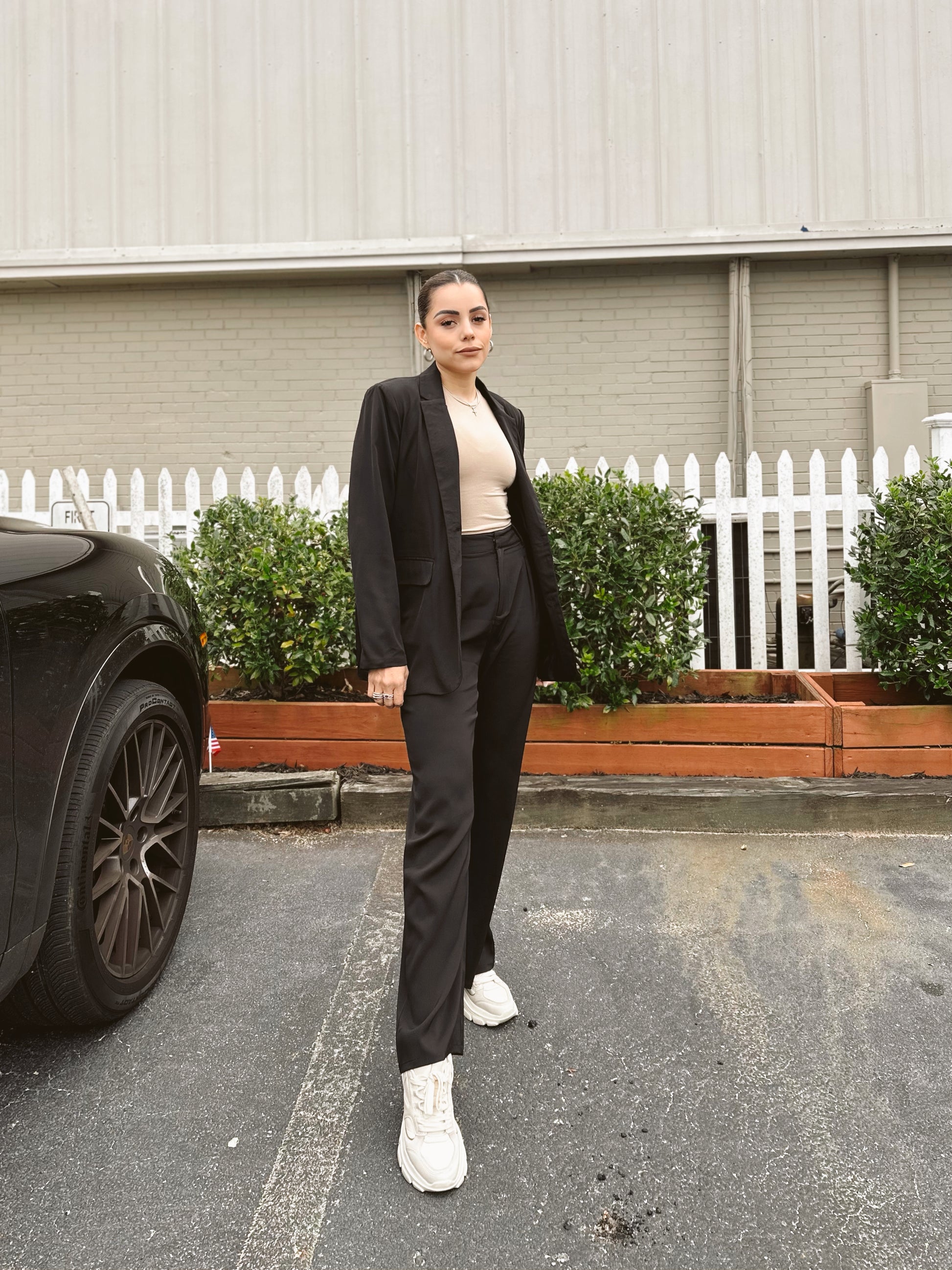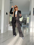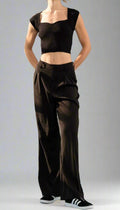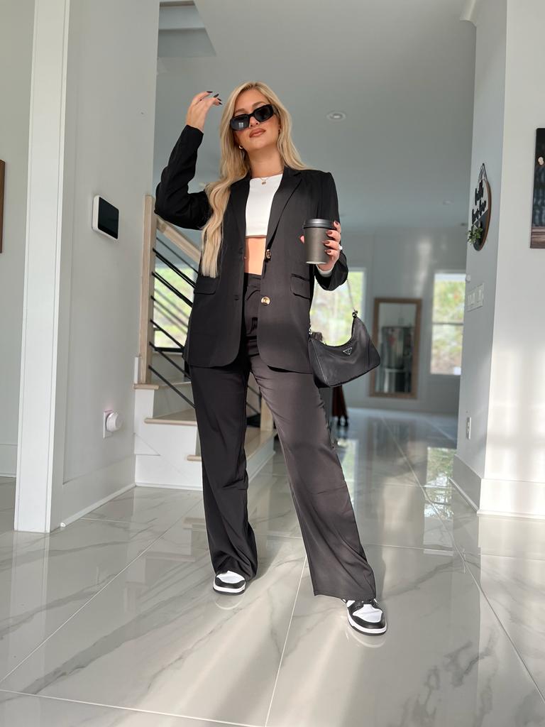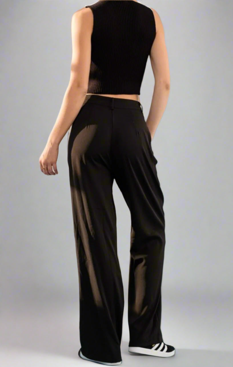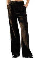 These high-waisted trousers feature detailed waist pleats and a wide-leg woven design for a chic, comfortable look. Made from 100% polyester, they combine durability with style. The pants measure 43 1/4 inches in outseam, 13 1/4 inches at the waist, and have a 10 1/2 inch leg opening. The model, standing 5'8", wears a size S, highlighting the flattering fit and elegant silhouette of these versatile trousers.