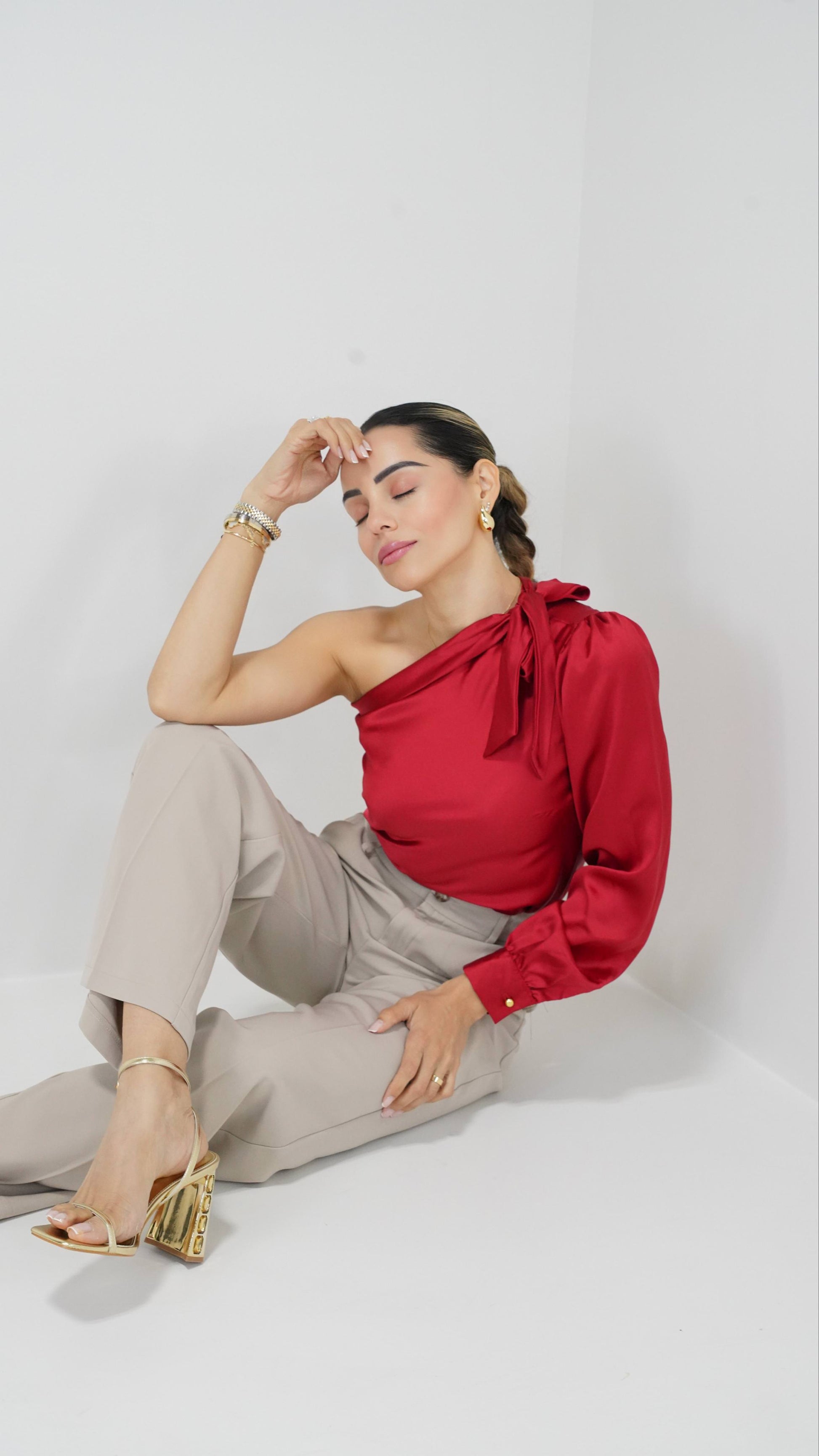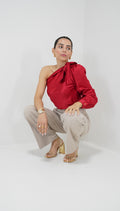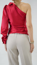 Introducing our elegant red silk top with one sleeve. This unique and stylish piece features a luxurious silk fabric and a single statement sleeve, adding a touch of sophistication to any outfit. Perfect for those who want to make a fashion-forward statement.