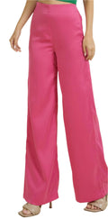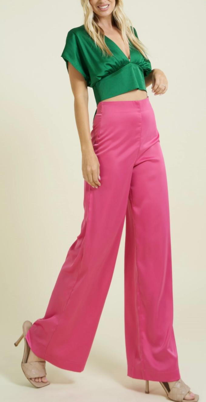 The high-waisted faux satin pant is a sleek garment with a luxurious satin-like material and a waistband that sits above the natural waistline, making legs look longer. It's a versatile choice for both formal and casual events, perfect for dressing up or down.