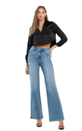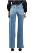 High rise wide leg A-line jeans: chic, versatile, and flattering. With a high waist and wide leg silhouette, these jeans are perfect for any occasion. Pair them with your favorite top.