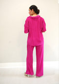 The Solid Pleated Bodre Two Piece Set is a chic and stylish outfit that includes a short sleeve top and wide-legged high-rise pants. The set features a unique and stylish pleated bodre fabric that adds texture and depth to the design. The top has a button-down front with short sleeves, and the pants have a flowy and relaxed fit that creates a comfortable and breezy feel. The high-rise design of the pants cinches in at the waist, creating a flattering silhouette that elongates the legs. The set can be worn together or as separate pieces, making it versatile and perfect for any occasion. This fashionable and modern outfit is perfect for a sophisticated and on-trend look.